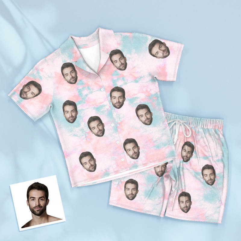 Custom Face Blue Tie Dye Pajamas Personalised Photo Short Sleepwear Love Gifts For Lover
