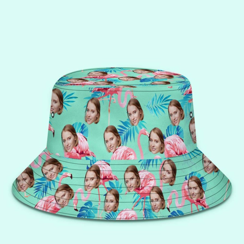 Custom Face Bucket Hat Flamingo Tropical Hat With Allover Printed Green and Palm Leaves