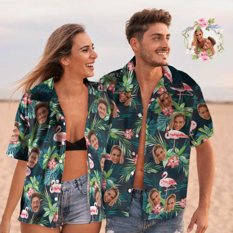 Custom Face Couple Matching Hawaiian Shirts Flamingo Flower Valentine's Day Gift