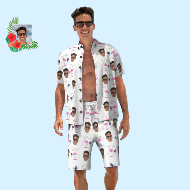 Custom Face Hawaiian Shirt And Beach Shorts Personalised Men's Photo Flamingo Print Vacation Party Gift