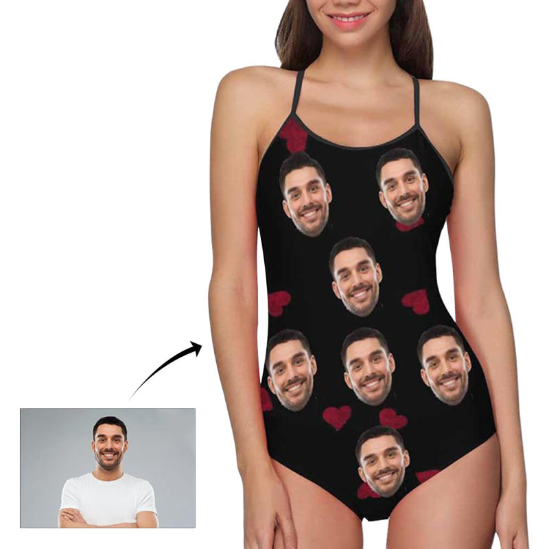 Custom Face Heart Black Women's Slip One Piece Swimsuit