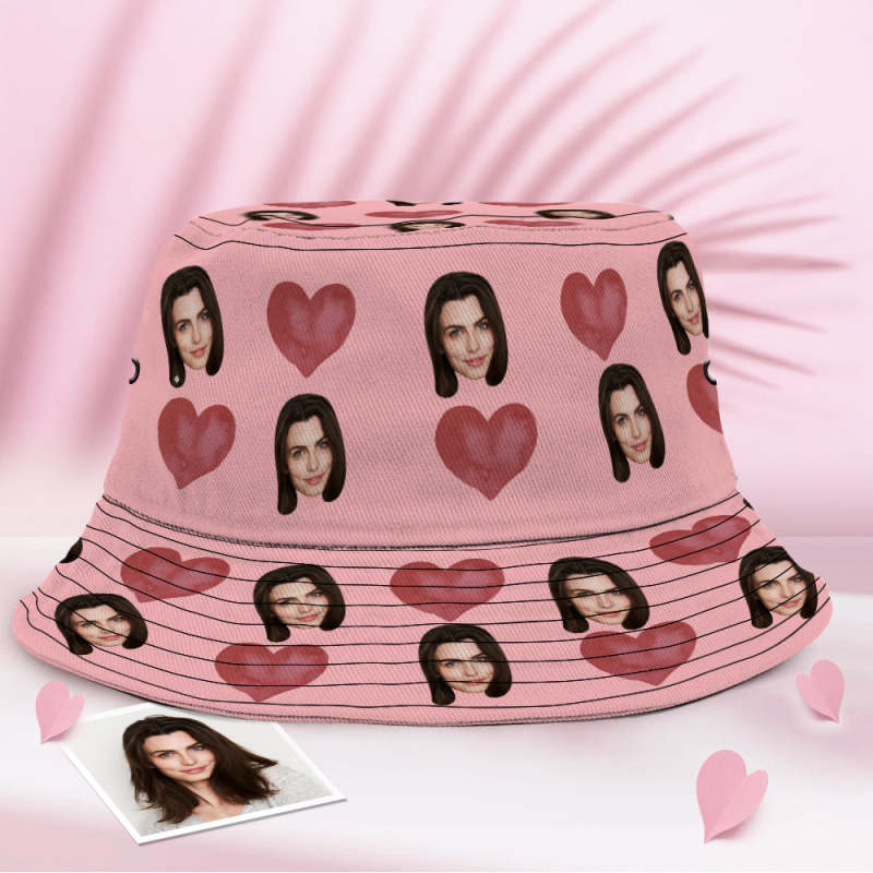 Home / Custom Face Pink Bucket Hat Unisex Personalised Photo Summer Cap Hiking Beach Hats - Red Heart
