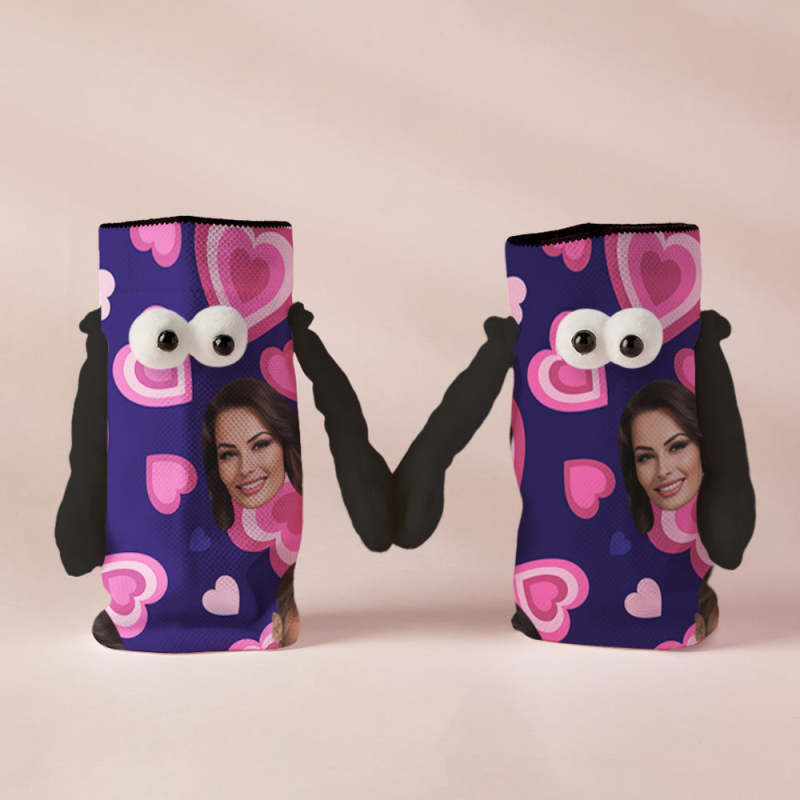 Custom Face Socks Funny Doll Mid Tube Purple Socks Magnetic Holding Hands Socks Pink Heart Valentine's Day Gifts