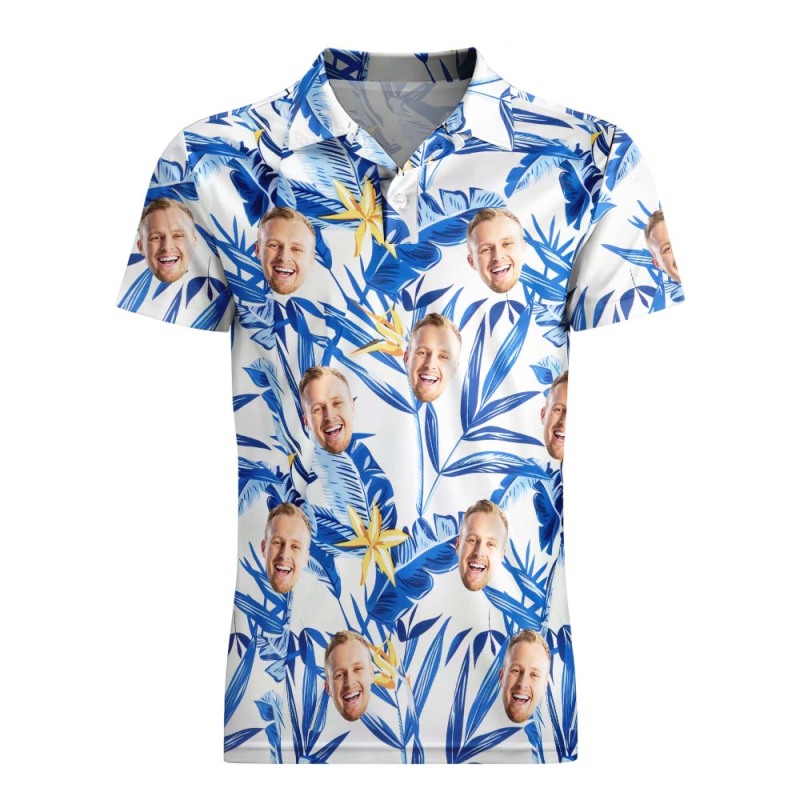 Custom Men's Face Polo Shirt Aloha Golf Polo Shirt Blue Leaves Gift For Him