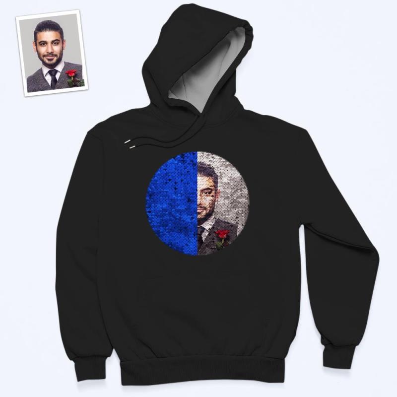 Custom Photo Blue Sequin Hoodie Circle Double Print Hoodie Gift for Men Women