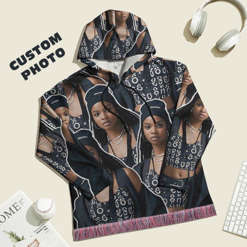 - Customizable Vintage Photo Design: Upload your favorite photo and have it transformed into a beautiful, vintage-style tapestry print that covers the front of the hoodie.