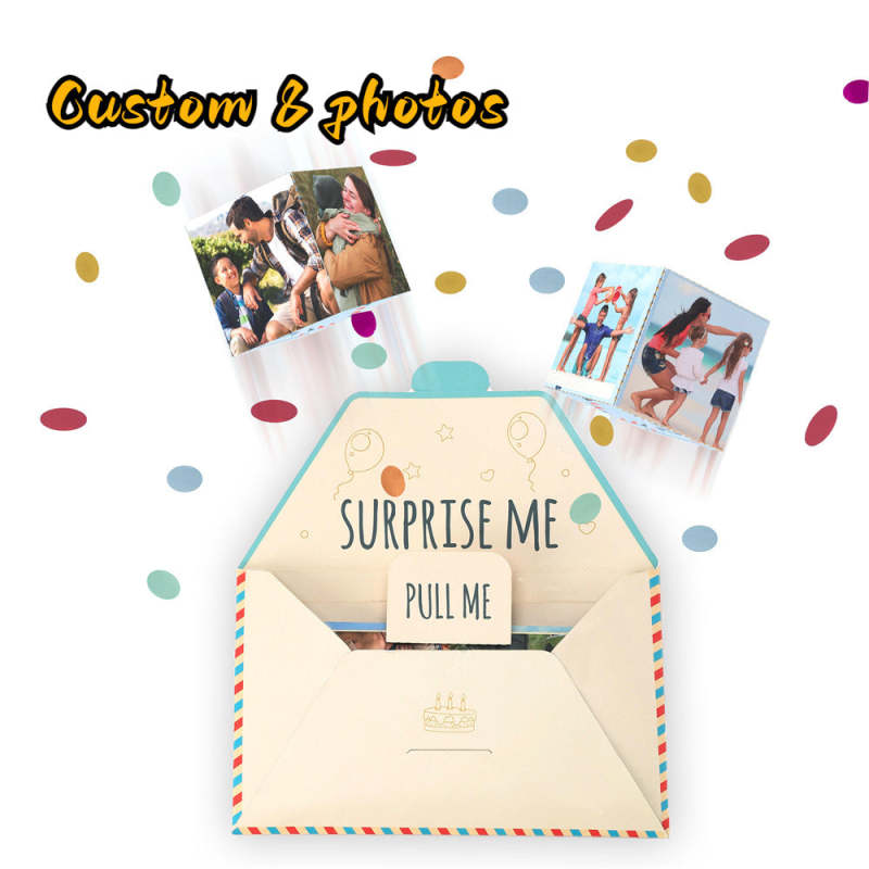 Not only does this envelope pop confetti, but it also features funny birthday-themed cubes that spring up when opened. These cubes showcase a variety of funny and trendy designs that add an extra layer of playfulness to the birthday surprise.